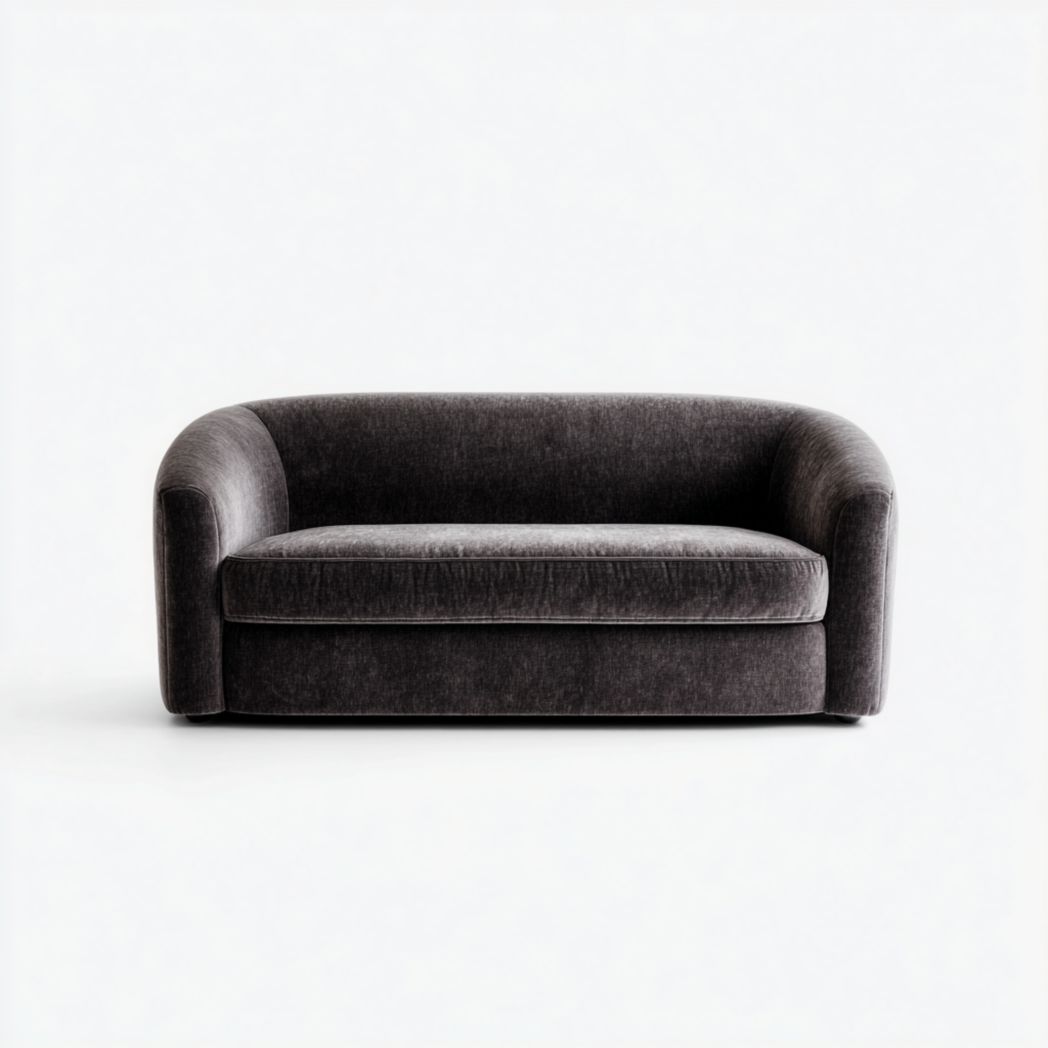 Canapé droit deux places en tissu gris foncé à accoudoirs arrondis